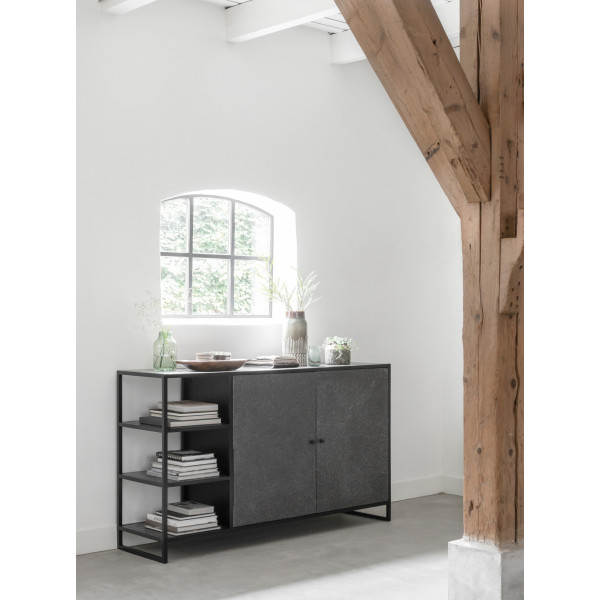 Príborník MUST Living Mont Ventoux má rozmery 150x45x92 cm a má konštrukciu z čierneho kovu. Poličky sú z tmavého čadiča.