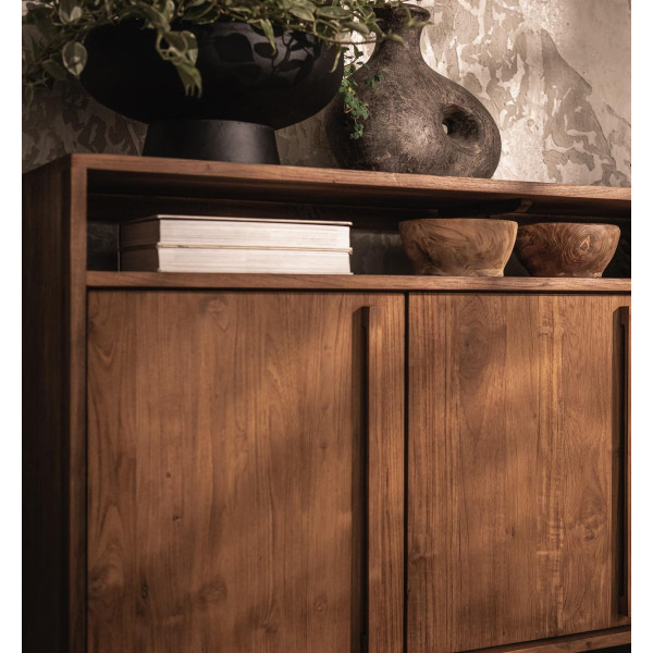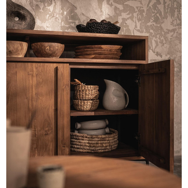 Príborník Outline je všestranná úložná jednotka, ktorú je možné použiť ako príborník alebo televízny stojan. Jeho čistý dizajn sa ľahko zmestí do každej miestnosti. Má tri priestranné priehradky na uloženie vašich vecí, ako aj otvorené police v hornej časti na ukladanie kníh alebo elektronických zariadení. Vyrobený z regenerovaného teaku a vybavený železnými nohami, tento kus nábytku meria 148x42,5x85