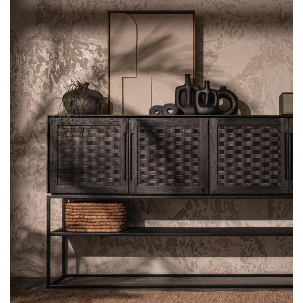 Tento príborník Karma so 4 dverami a 1 policou je elegantný a ručne vyrobený kus nábytku z regenerovaného dreva. Má štyri ručne tkané ratanové dvere, ošetrené ekologickým matným čiernym povrchom a moderným železným rámom. Otvorená polica je ideálna na zobrazenie vašich obľúbených pokladov, zatiaľ čo zvyšok sa dá ľahko uložiť za krásne štruktúrovanými dverami. Tento kus nábytku s rozmermi 205x40x110 cm je praktický aj estetický.