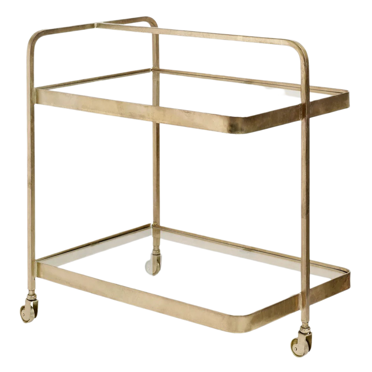 Tento železný vozík so sklom je malá úložná jednotka. Je to minimalistický kus nábytku, ktorý sa používa ako príručný stolík pri pohovke alebo ako štýlový barový vozík na fľaše a poháre. Vďaka svojej zlatej povrchovej úprave je tento vozík skutočným elegantným doplnkom, ktorý je praktický aj funkčný. Má rozmer 70x50x75 cm.