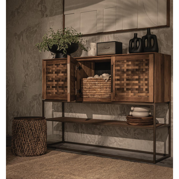 Karma bielizník je elegantný, vintage kus nábytku, ktorý je ručne vyrobený z regenerovaného teaku a železa. Tri regenerované teakové dvere majú krásnu textúru a skrývajú šesť odnímateľných políc pre ľahké skladovanie. Spodný stojan je ideálny na zobrazenie vašich obľúbených kníh alebo knickknacks. Železný rám je dokončený z matnej mosadze. Jednotka meria 155x40x110
