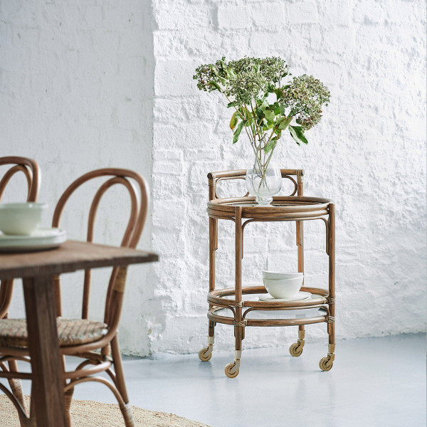 Vozík Romeo, dostupný v dvoch odtieňoch, je vyrobený z ratanu, prírodného materiálu. Integrovaný do kolekcie Originals môže byť transformovaný na bočný stolík alebo malý bar, ideálny pre kuchyňu alebo obývaciu izbu. Kompaktný s rozmermi 212x108x77 cm a kolesami, kombinuje funkčnosť a štýl v