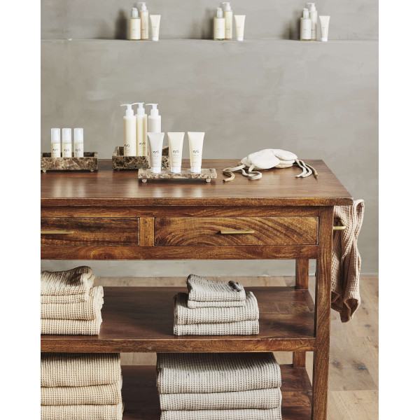 Tento kaspický stôl je vyrobený z mangového dreva a železa pre moderný rustikálny vzhľad. Má tri zásuvky a dve police. Môže byť použitý v kuchyni, kúpeľni alebo ako displej. Táto tabuľka má zlaté rukoväte a držiak na obrúsky a utierky. Táto položka meria 180x70x90 cm.