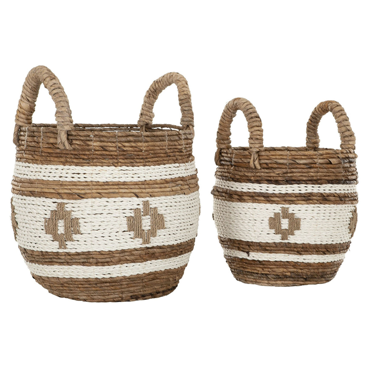 Toto duo košov Cuzco má prirodzený povrch s elegantným vzorom. Tieto koše kombinujú funkčnosť a estetiku, poskytujú očarujúci doplnok priestoru a zároveň poskytujú praktické riešenie skladovania. Ich všestranný dizajn ich robí vhodnými pre rôzne štýly domácej výzdoby. Táto sada košov pozostáva z koša s rozmermi Ø28x37 cm a Ø36x41 cm.