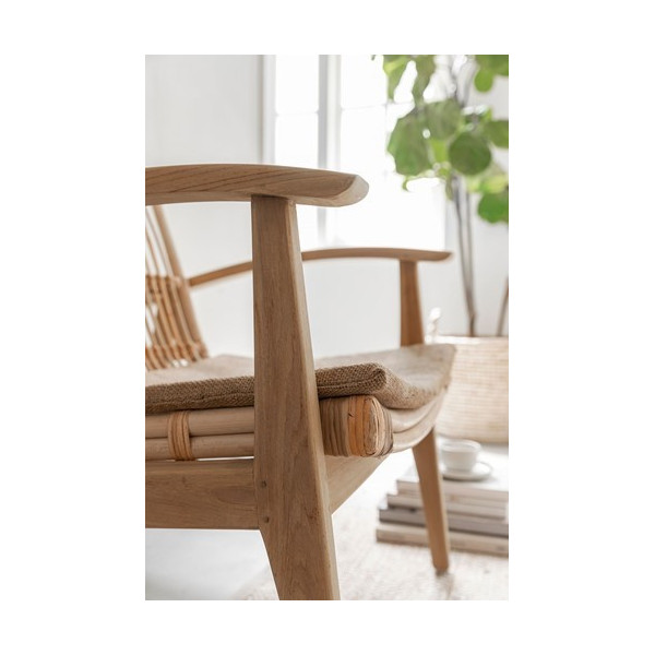 Totokreslo Marvin od spoločnosti Mut Living prináša prekvapivý vzhľad so svojím škandinávskym štrukturálnym štýlom. Vyznačuje sa štruktúrou z teakového dreva, ratanovým operadlom a sedákom a jutovým vankúšom. Toto ručne vyrobené kreslo má rozmery 68x75x75 cm. Táto stolička poskytne jedinečnú výzdobu s prirodzenou farbou v dome.
