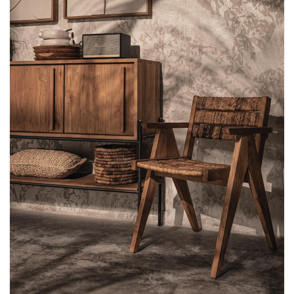 Caterpillar Brawny je moderná stolička, ktorá kombinuje rustikálne a moderné. Vyrobené z regenerovaného teakového dreva a v kombinácii s operadlom a sedadlom tkaným ručne s abacou, táto stolička má rustikálny, ale klasický vzhľad. Tradične navrhnutý našimi miestnymi remeselníkmi, Brawny je výrazná stolička, ktorá obstojí v skúške času. Meria 55x56x80,5 cm.
