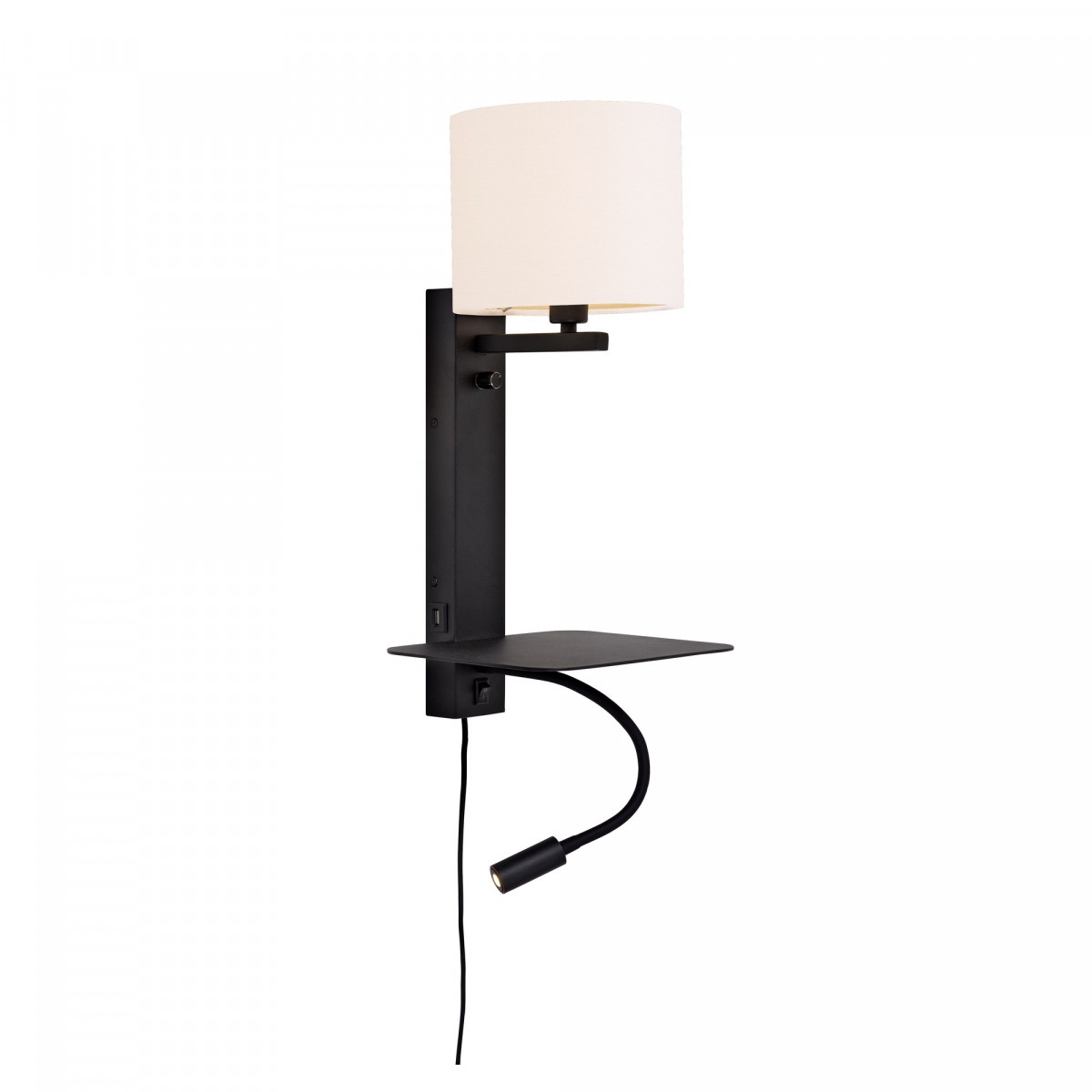 Nástenná lampa Florence, vyrobená zo železa a bavlny, okamžite dodá miestnosti moderný nádych. Jej dizajn s mini-polickou ju robí úplne praktickou a funkčnou. Okrem toho má jej nástenný povrch USB port na jednoduché nabíjanie vášho smartfónu. Vyznačuje sa výškou 50 cm, dĺžkou 30 cm a základnou veľkosťou 3,5x6x38 cm. Tento svietidlo sa odlišuje tienidlom s priemerom 18 cm a výškou 15 cm. Skladá sa z objímky E27 (žiarovka nie je súčasťou balenia).