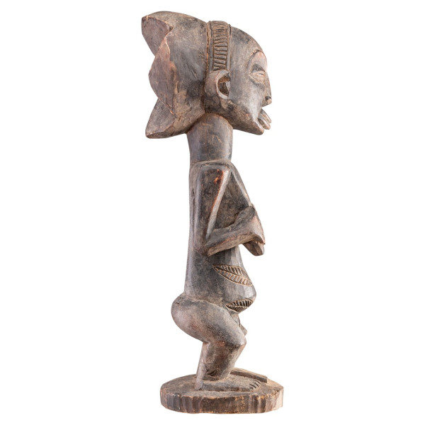 Táto predková ženská postava Hemby z 20. storočia, pôvodom z DR Konga, má klasické držanie tela s rukami spočívajúcimi na hrudi a pootvorenými očami. Preplnený šľachtou predkov posilňuje rodinnú líniu, ktorá sa často vystavuje počas rozhodujúcich obradov. Ako duchovný kontajner uľahčuje spojenie medzi svetom mŕtvych a živých. Krásne skarifikácie na bruchu dodávajú tomuto jedinečnému kusu z prírodného dreva s rozmermi 38x25,5x87,5 cm významný estetický rozmer, ktorý stelesňuje umelecké a duchovné dedičstvo kmeňa Hemba. Je to jedinečný kúsok.