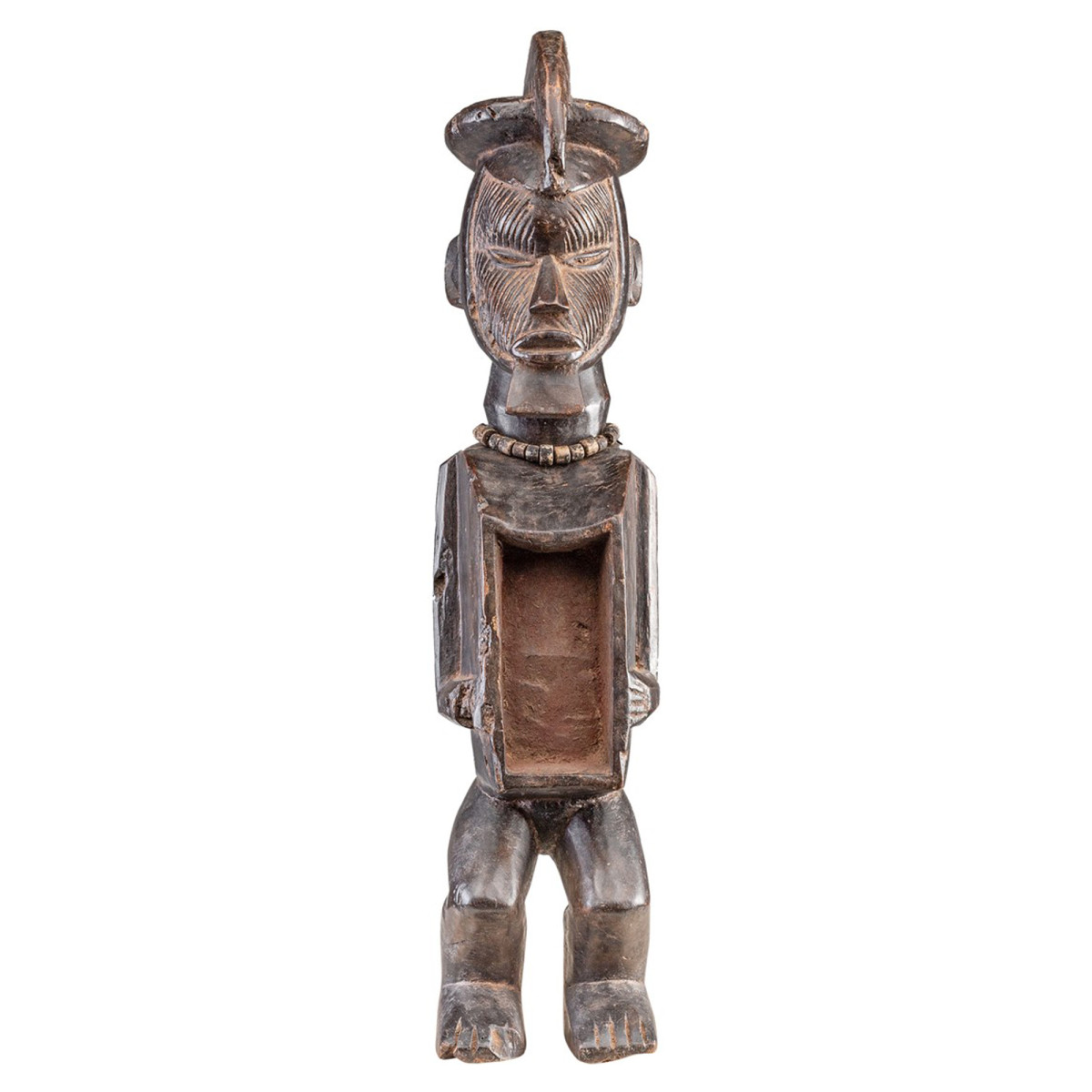Táto ikonická postava predka Hemby, pochádzajúca z 20. storočia a pôvodom z DR Konga, má klasickú pózu s rukami položenými na pupočníku a pootvorenými očami. Zodpovedný za šľachtu predkov symbolizuje duchovnú silu, posilňuje rodinnú líniu počas významných obradov. Ako duchovný kontajner uľahčuje spojenie medzi svetmi mŕtvych a živých. Tento jedinečný kus s rozmermi 15x11,5x55 cm, vyrezávaný z prírodného dreva, stelesňuje hlboké umelecké a duchovné dedičstvo kmeňa Hemba, čo svedčí o ich kultúrnom pôvode v DR Kongo.