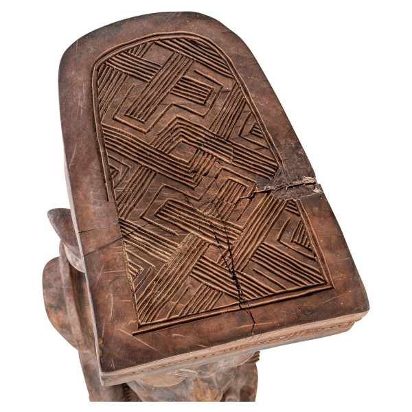 Táto socha Ndop predstavuje kráľa kultúry Kuba v Konžskej demokratickej republike. Pochádza z polovice 20. storočia a meria 44x38x156 cm. Socha je vyrezávaná s presnosťou a zobrazuje pokojnú tvár s dobre definovanými geometrickými črtami, napoly zatvorenými očami a uzavretými ústami. Sedí s kráľovským držaním tela, ruky spočívajú na kolenách. Trup je zdobený zložitým pásom a vzormi, ktoré by mohli symbolizovať vysoké postavenie alebo duchovné vlastnosti. Táto práca je vyrezávaná z dreva, ktoré časom nadobudla bohatú patinu, pričom zdôrazňuje jemne vyrezané detaily a reliéfne vzory na stojane sochy.