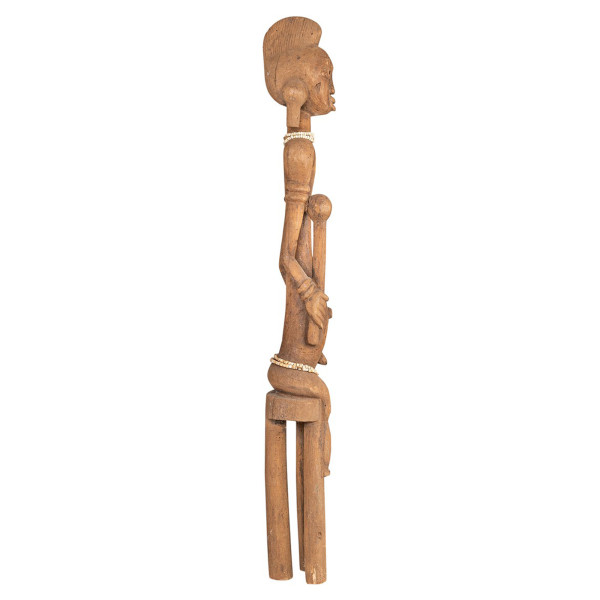 Kmeňová socha Mumuye, dielo sochára Rati alebo Molabaiene, fascinuje svojimi dlhými kyvadlovými ramenami so špachtľovanými rukami a výrazným pupkom. Úzka hlava, nosená mohutným golierom, má výrazný účes klanu a uši predĺžené náušnicami, vyhradené pre ženy. Unikátny, vyrobený z prírodného dreva, s rozmermi 17x18,5x122,5 cm, datovaný do polovice 20. storočia, pôvodom z Nigérie v kmeni Mumuye.