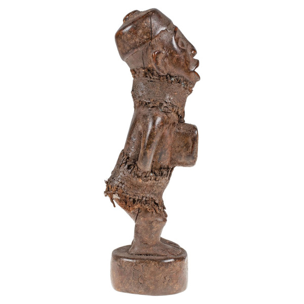 Fetišové zrkadlo v rafinovanom skle z kmeňa Bakongo v Konžskej demokratickej republike. Táto socha má autentickú starú patinu, výrazné oči a sklenené bilongo. Bakongo fetiše s rozmermi 5,5x6,5x20,5 cm slúžili ako ochrancovia, odpudzovali škodlivých duchov, liečili choroby a oslavovali záväzky. Tento jedinečný kus dreva a skla, pochádzajúci z 20. storočia, odráža starodávnu duchovnú múdrosť kmeňa Bakongo.
