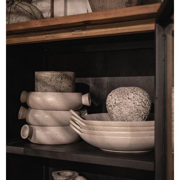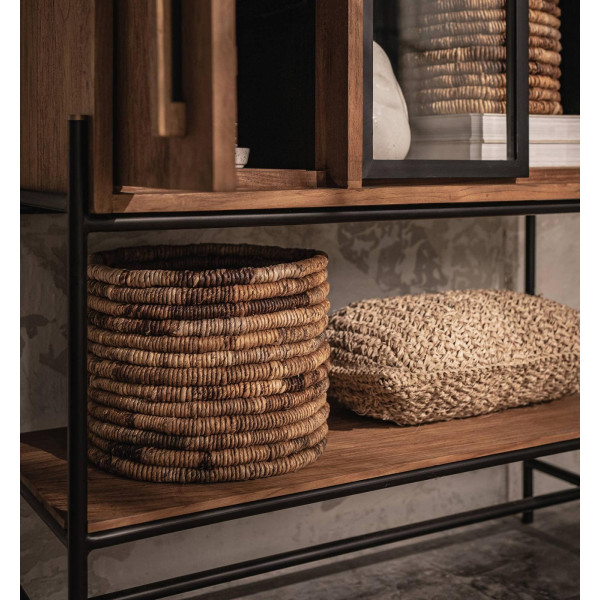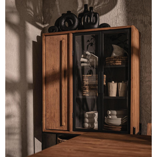 Skriňa Outline s 3 dverami, z ktorých 2 sú sklenené, je kusom nábytku v modernom a priemyselnom štýle. Ručne vyrobené z regenerovaného teakového dreva a železného rámu, táto robustná skrinka ponúka dostatok priestoru. Za dvoma sklenenými dverami sú tri police, zatiaľ čo drevené dvere dokonca odhaľujú štyri police, aby vyhovovali všetkým vašim potrebám pri skladovaní. Vďaka svojim rozmerom 95x38x160 cm je táto skrinka praktická aj estetická.