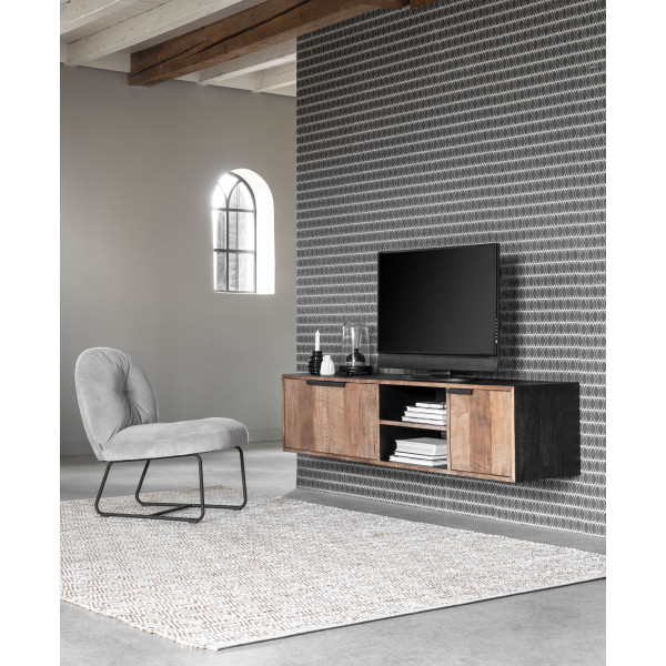 Závesná TV skrinka Cosmo No.1 je vyrobená z recyklovaného teakového dreva pre autentický a prirodzený vzhľad. Má rozmery 165x40x40 cm a obsahuje 3 dvierka a 2 otvorené police.