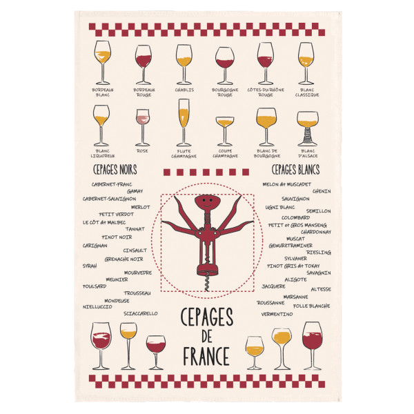 Ideálny pre nadšencov enológie, tento model „Vína a odrody hrozna“ ponúka klasifikáciu čiernych a bielych odrôd hrozna z Francúzska. Tento čajový uterák vyrobený vo Francúzsku zo 100% bavlny je špeciálne navrhnutý tak, aby sa staral o riad jemným utieraním. Má rozmer 50x70 cm a je zafarbený v ecru.
